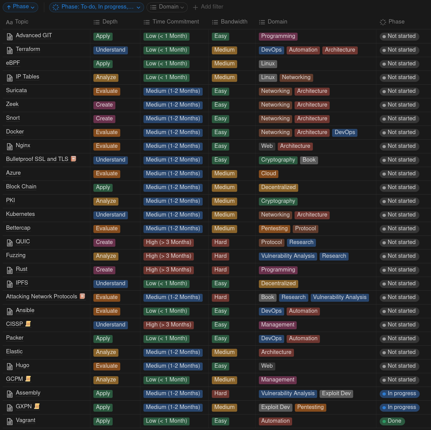 Another highlight of this year was finally finding a way of capturing a list of all the tools/technology/concepts I want to learn. I settled on using notion to build my Learning List that helps me keep track of technology I wish to learn, the depth in which I want to learn it, how long it might take, and how difficult it is. I have only started doing this in the last couple months but it has already been immensely helpful in visualizing and organizing my every-growing list of technology to learn. As of writing, here is my current list.