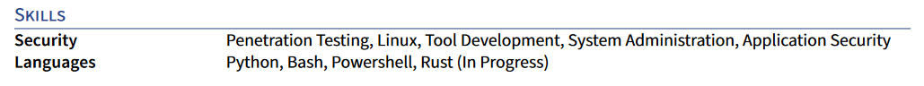 Note I highly recommend checking out Lesley Carhart’s “Landing a Job: Resumes and the Application process” talk on this topic! and if you want more information on job hunting specifically, check out Jason Blanchard’s “Infosec Job Hunting” webcast.