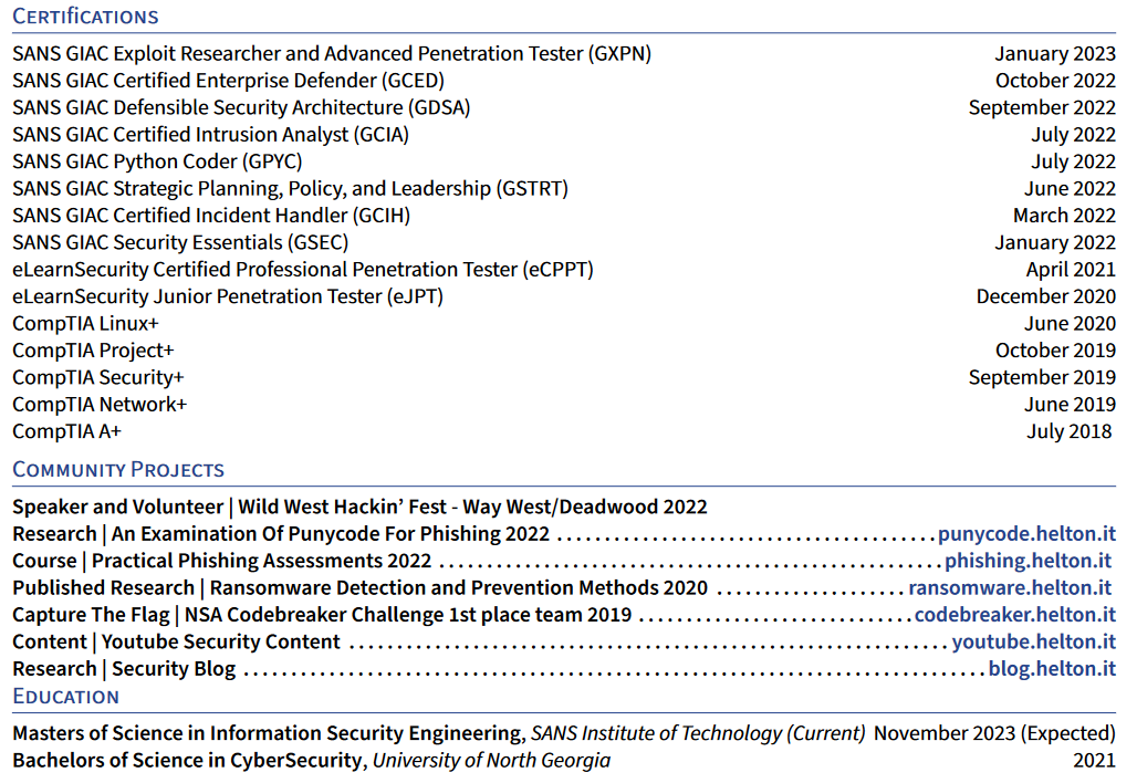 - Certs: A+, Net+, Security+, Project+, Linux+, eJPT, eCPPT, GSEC, GCIH, GSTRT, GPYC, GCIA, GDSA, GCED, GXPN