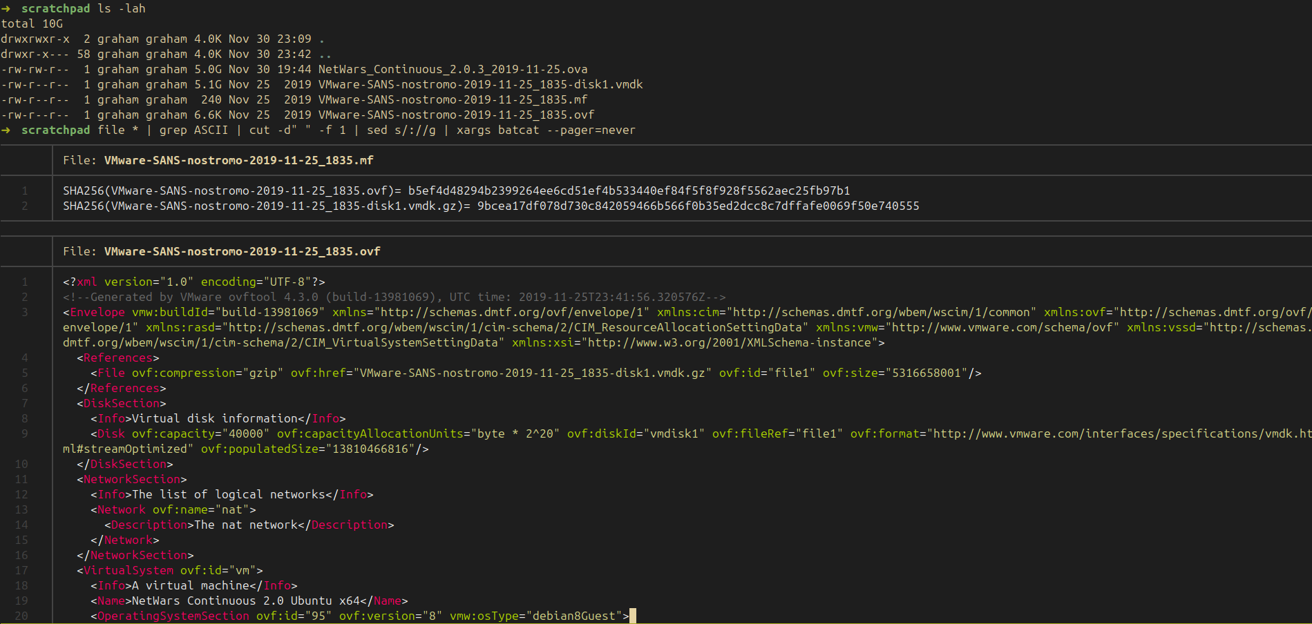 OVA Files: Essentially a tar of various files described in the Open Virtualization Format (OVF) needed for virtual machines to work. If we look at the .ova file I will be converting we can verify that after running tar xvf NetWars_Continuous_2.0.3_2019-11-25.ova, we can see the files were extracted: