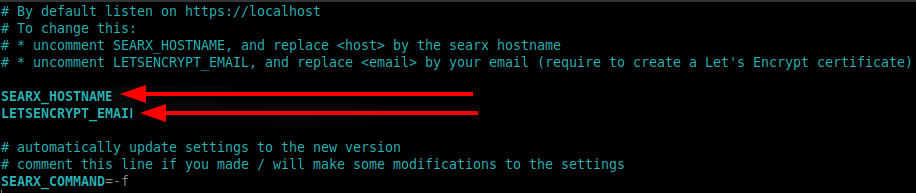 SEARX_HOSTNAME=variable and add a valid email to the end of theLETSENCRYPT_EMAIL=variable. This is required for getting a valid letsencrypt certificate.
