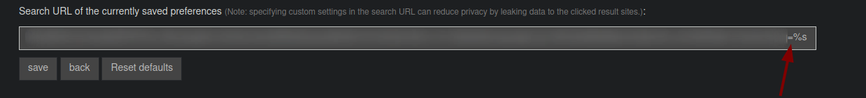 In order to tell flame what search engine you want to use, you need the “search url” of your searx instance. To get this head the “preferences” tab of your searx instance and scroll down to the Search URL. Copy this long string of text and make sure you don’t include anything after the “=” at the end of the string. Anything after that “=” will be queried when you search using flame.